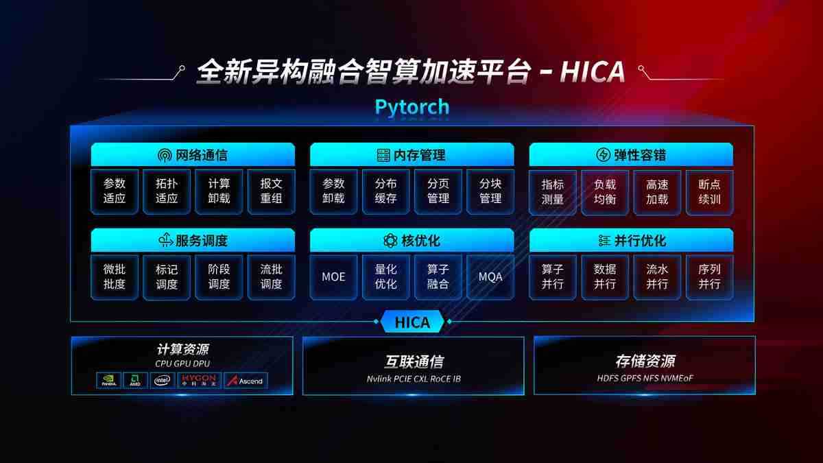 通过自研的服务层、、、、中间适配层、、、以及调度编排算法,,,,采用数据并行、、、、模型并行等多种并行方式,,,,把并行计算任务进行有效的分解,,,使其分别由相应的软件栈和算力资源来承接。。。。当GPU资源变化,,,HICA可以实时动态调度计算子任务并调整模型拓扑和架构,,,,以充分聚合各种算力资源。。