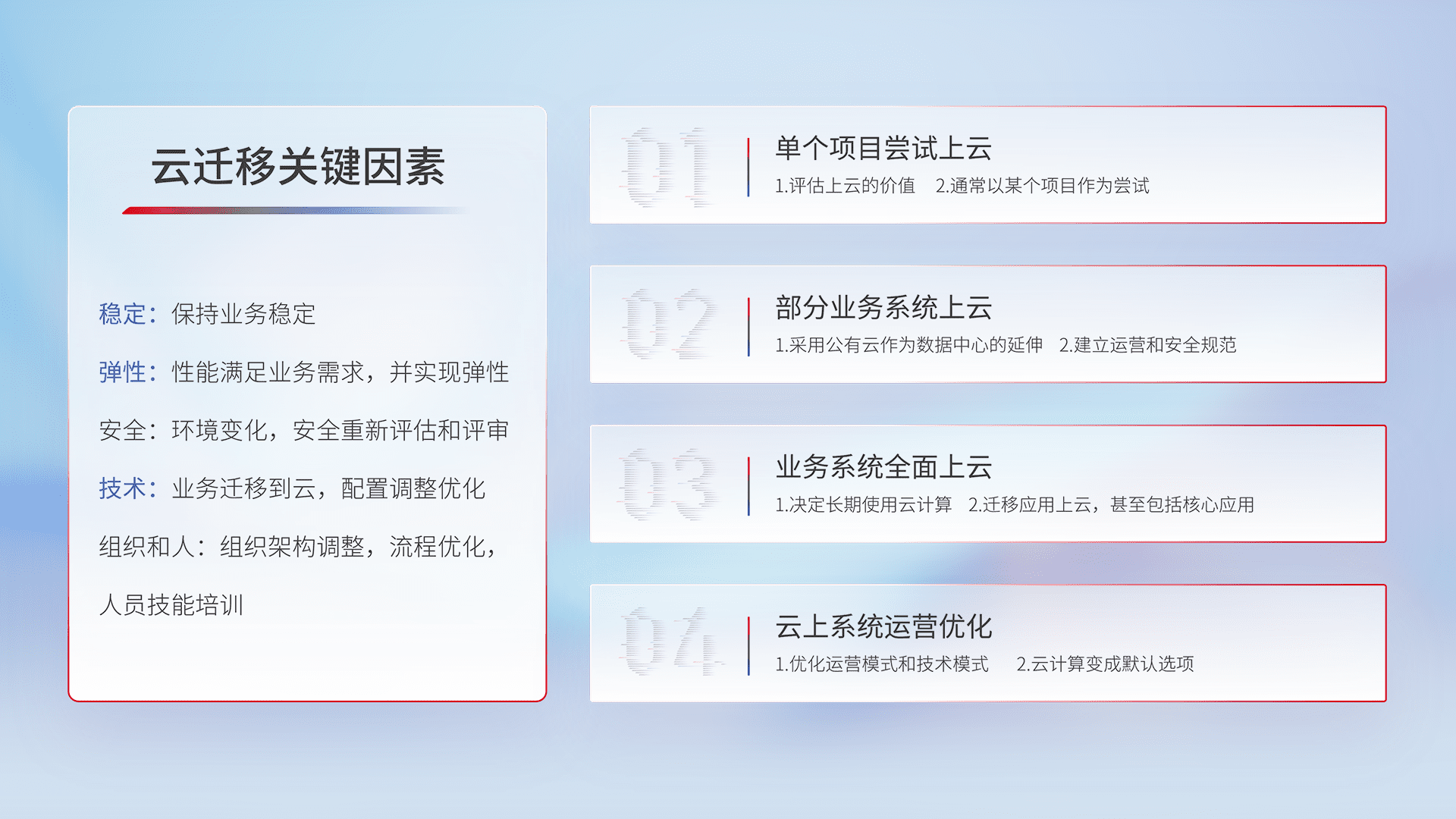 结合实际业务,,从规划设计、、、、云平台选型、、云原生改造、、、、数据迁移、、集成交付,,,迁移全过程为客户识别最佳上云路径,,,,做好风险识别管理,,,,设计网络架构、、、身份权限、、安全审计合规、、、、操作审计、、、日志审计、、、、监控告警策略、、、多站点容灾设计等,,,,对云上基础设施进行整体规划,,,,提升IT治理水平,,,以满足弹性、、高可用、、高性能的需求。。