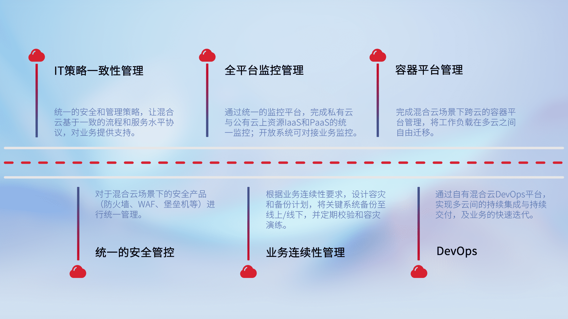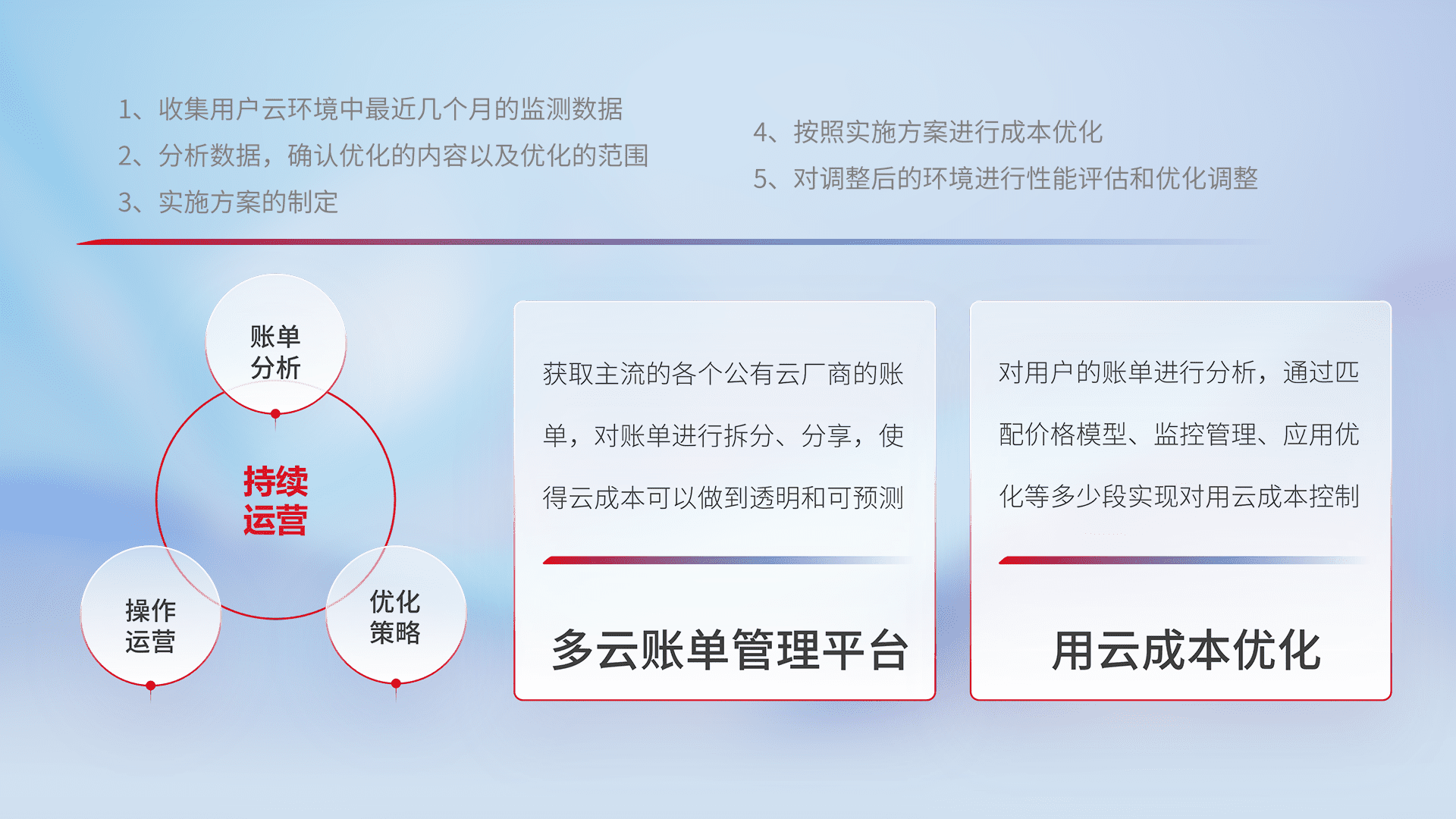 通过多云纳管,,,以统一的资源数据模型把客户的云资源进行抽象和封装,,,进而实现对多云资源的统一操作,,,保障云资源管理的可靠性、、稳定性与可用性。。量身定制化运维内容,,,,配置、、、开发运维、、、、补丁管理、、、备份、、、、监控、、认证和访问管理、、审计和日常巡检等,,,保障在用云过程中的可靠度,,,稳定度以及高可用率。。。