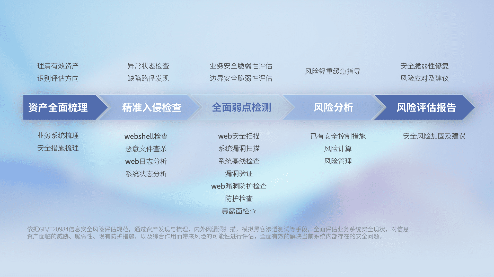 针对客户行业特性,,,,以专业的安全服务+多厂商联合解决方案提供专属的一站式安全管理服务,,,帮助客户全面感知网络空间威胁,,,基于识别、、、检测、、、分析、、、、防护、、、监测、、、、响应的服务理论模型,,从方案咨询、、、、集成交付、、评估验证、、优化加固、、、运维运营,,,致力于为客户提供完整的闭环管理式安全服务。。以实战经验为客户打造高抵御风险的安全体系,,,,帮助客户发现威胁、、对抗威胁、、处置威胁,,不断积累安全对抗能力,,,,持续保障数字化安全。。。